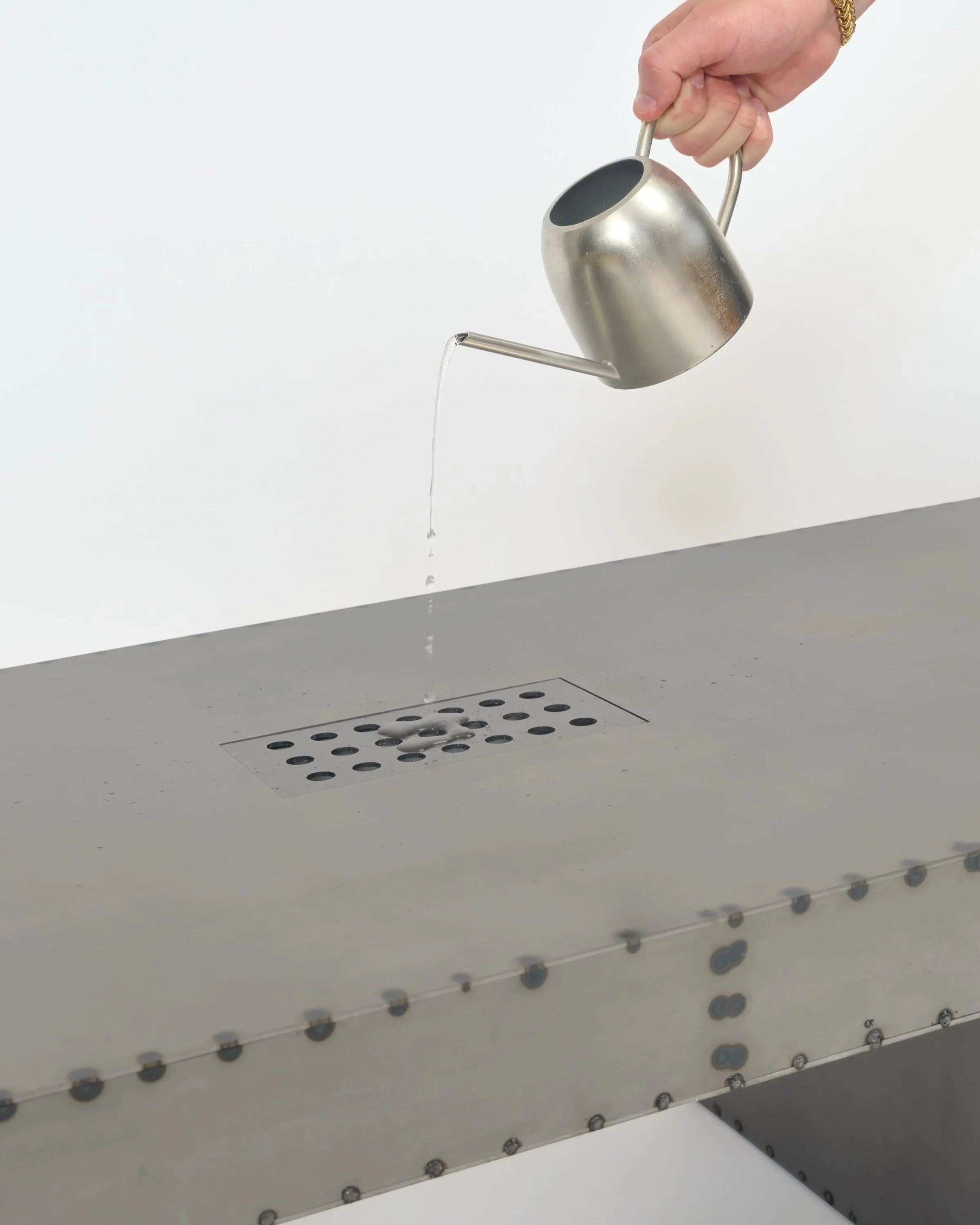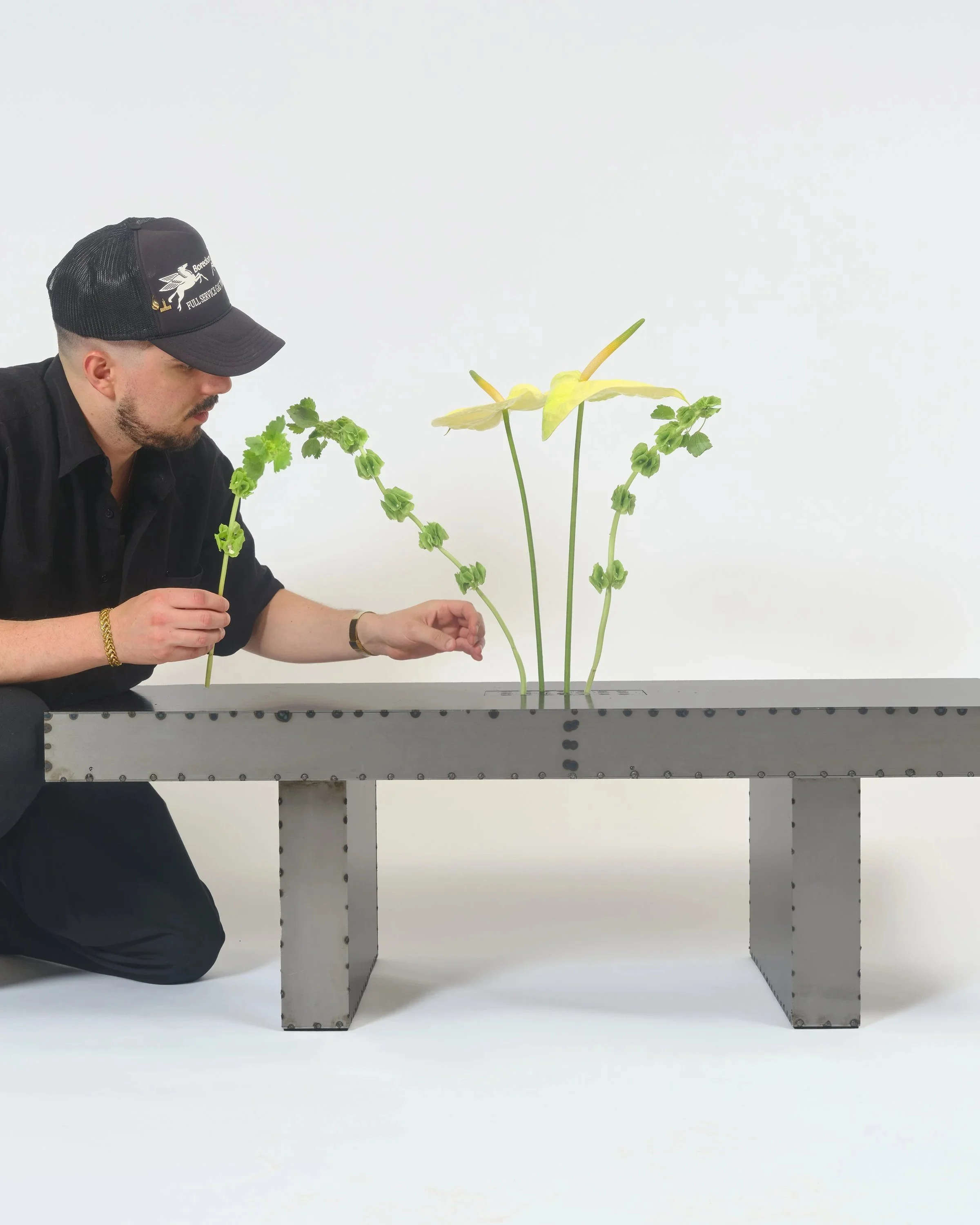 At its centre, a recessed chamber holds a removable, EDM-machined aluminum bin that serves as a water reservoir along with the Stiletta Tray - a spiked, multi-functional insert inspired by traditional flower frogs. Designed to hold flowers upright, incense, or candles, the tray can also be used on its own as a minimalist catchall for keys and other small objects. Both components are fully removable for cleaning.