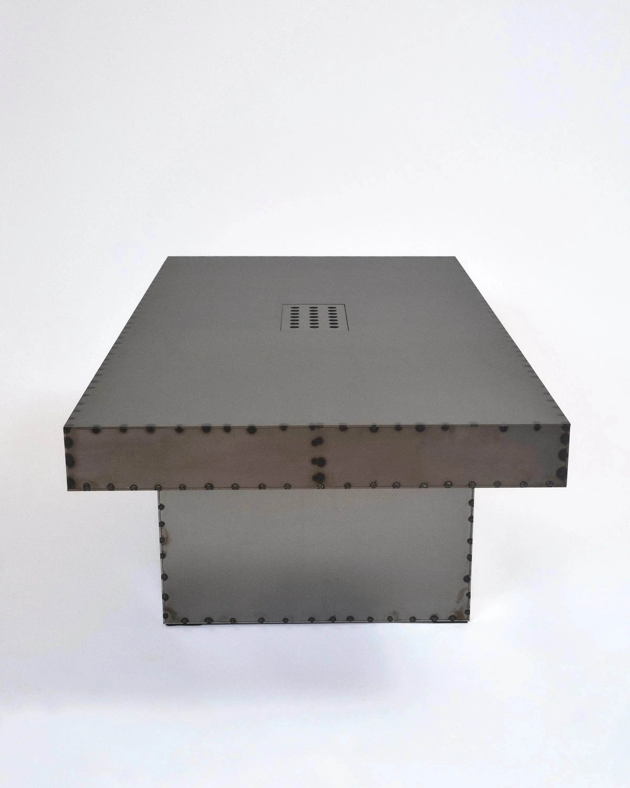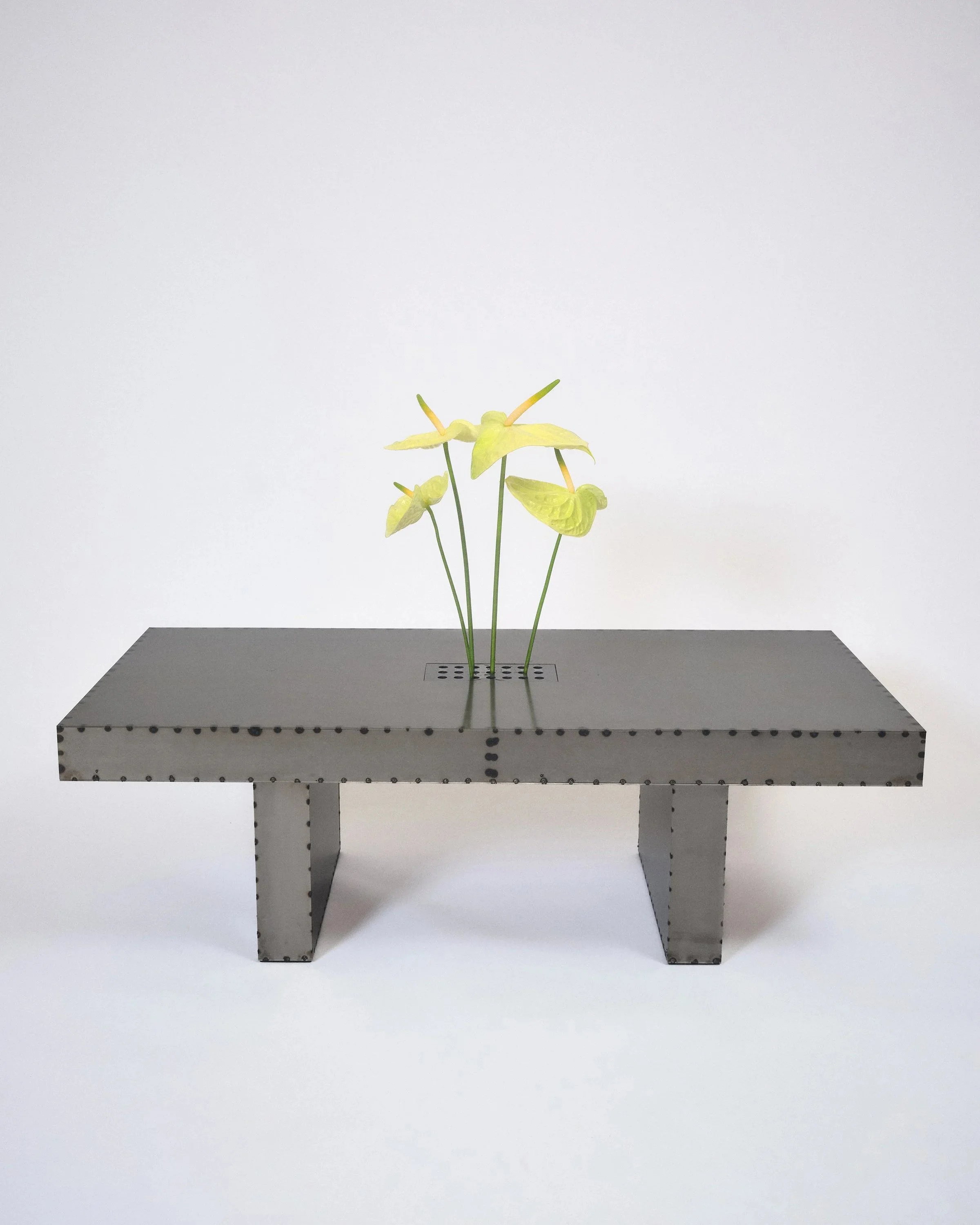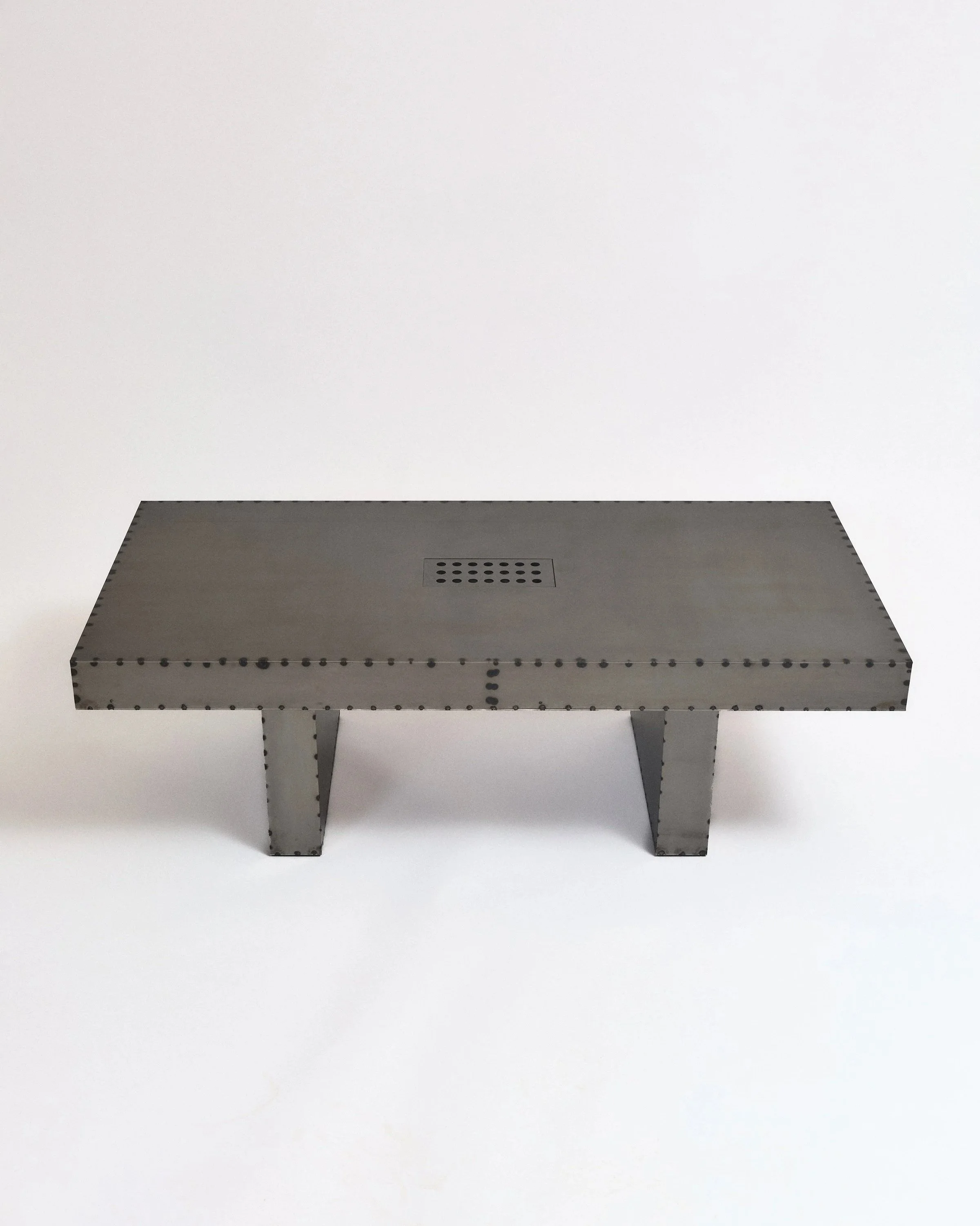 Brutal Table uses raw metal, intentionally left unrefined. Markings from the processing and handling of the material are kept under a clear coat finish, preserving the material’s history and making each table visually unique.