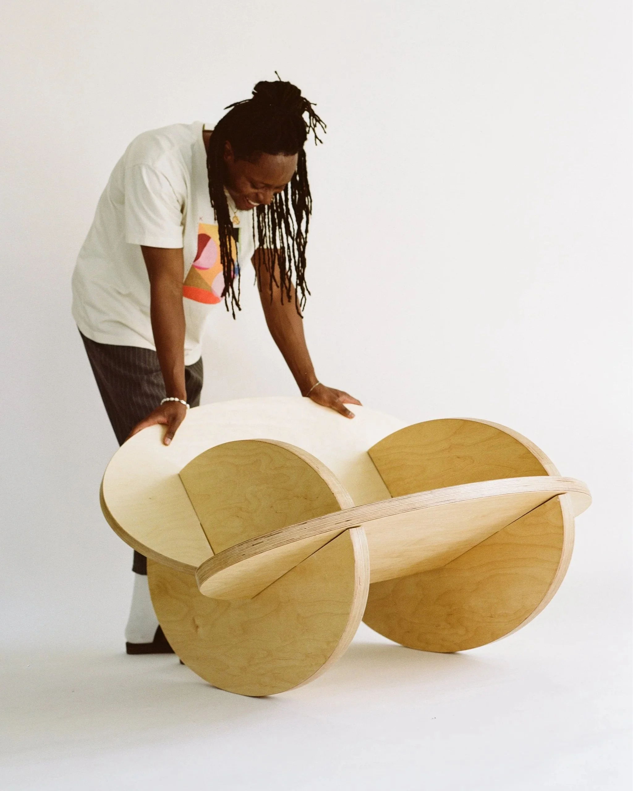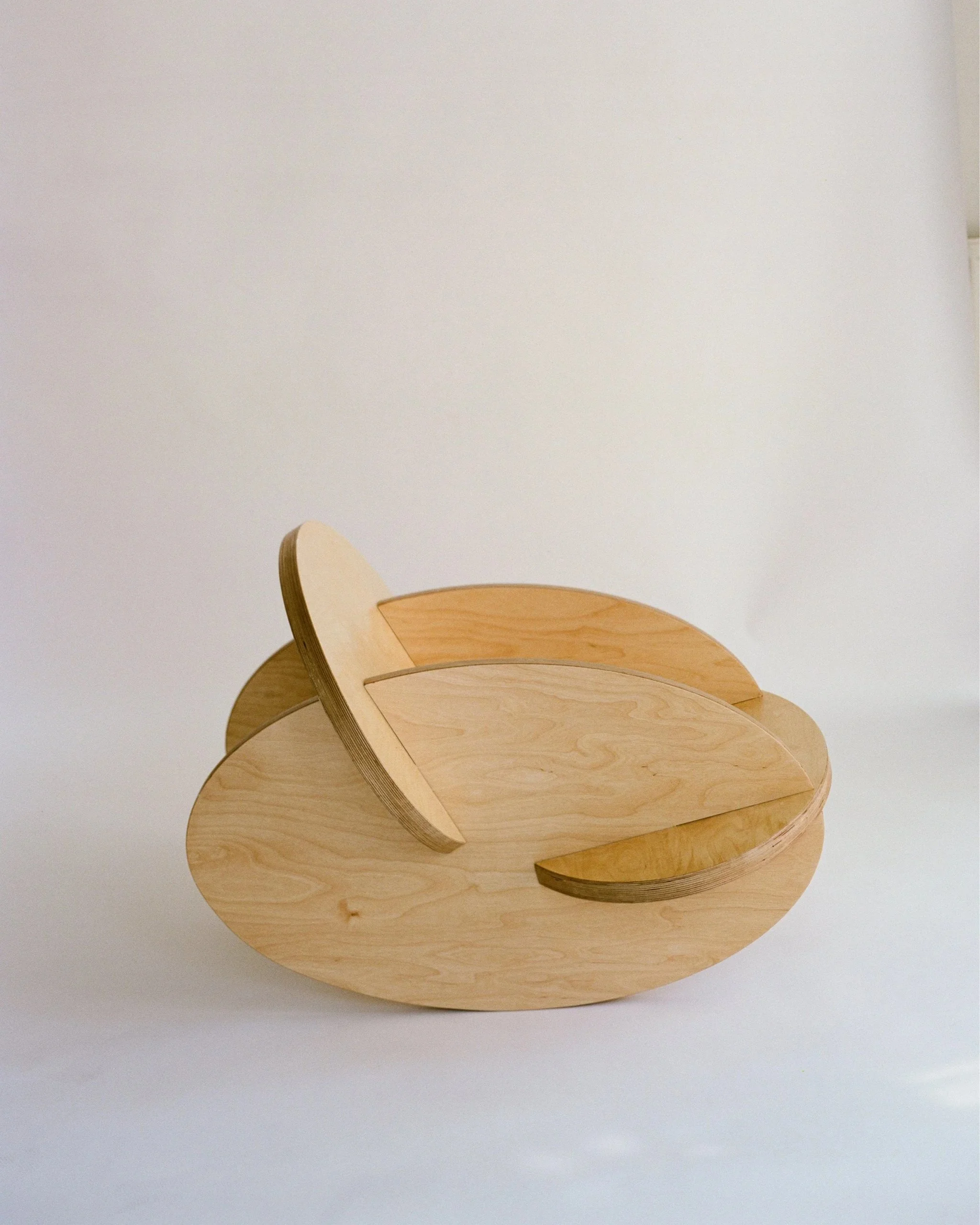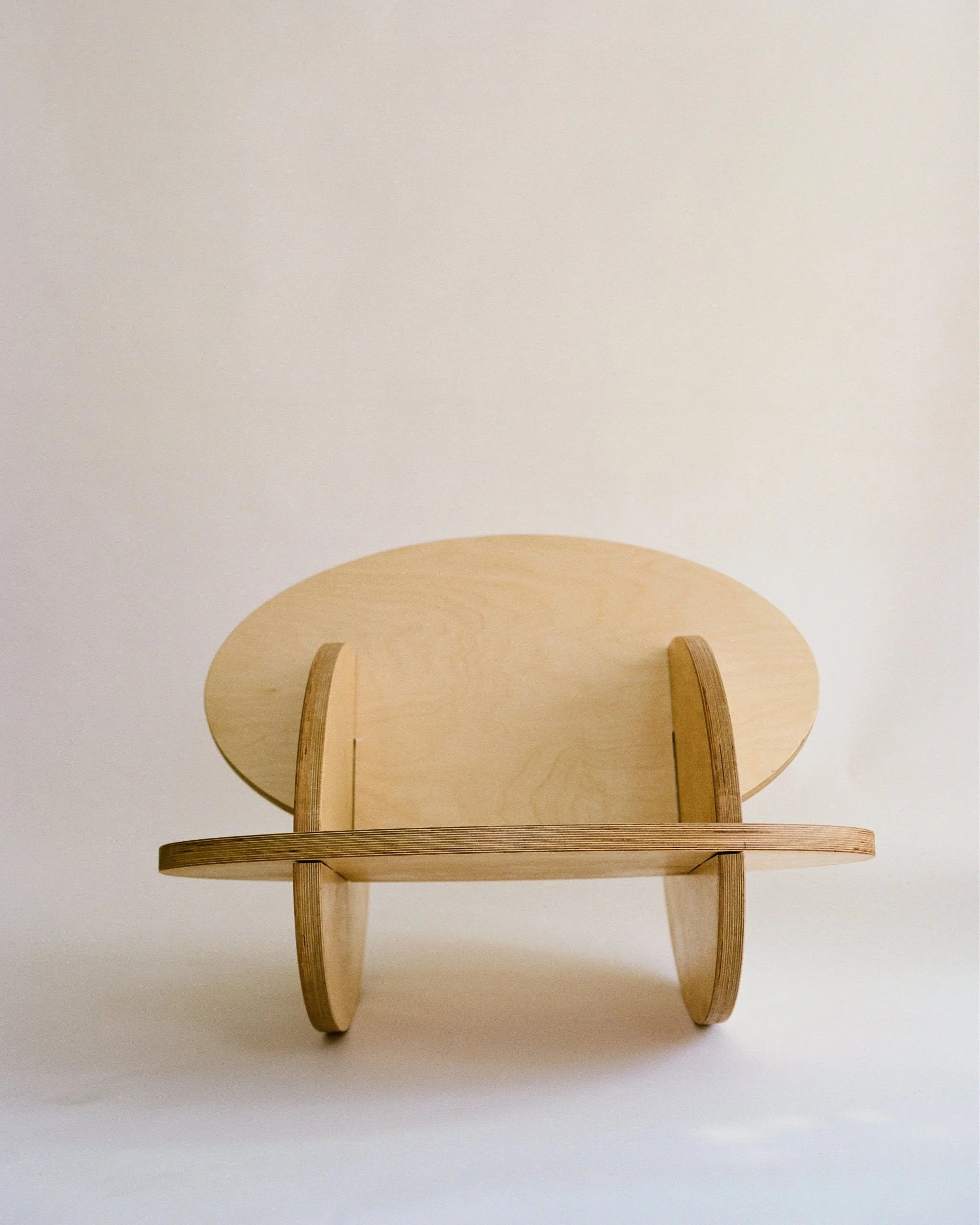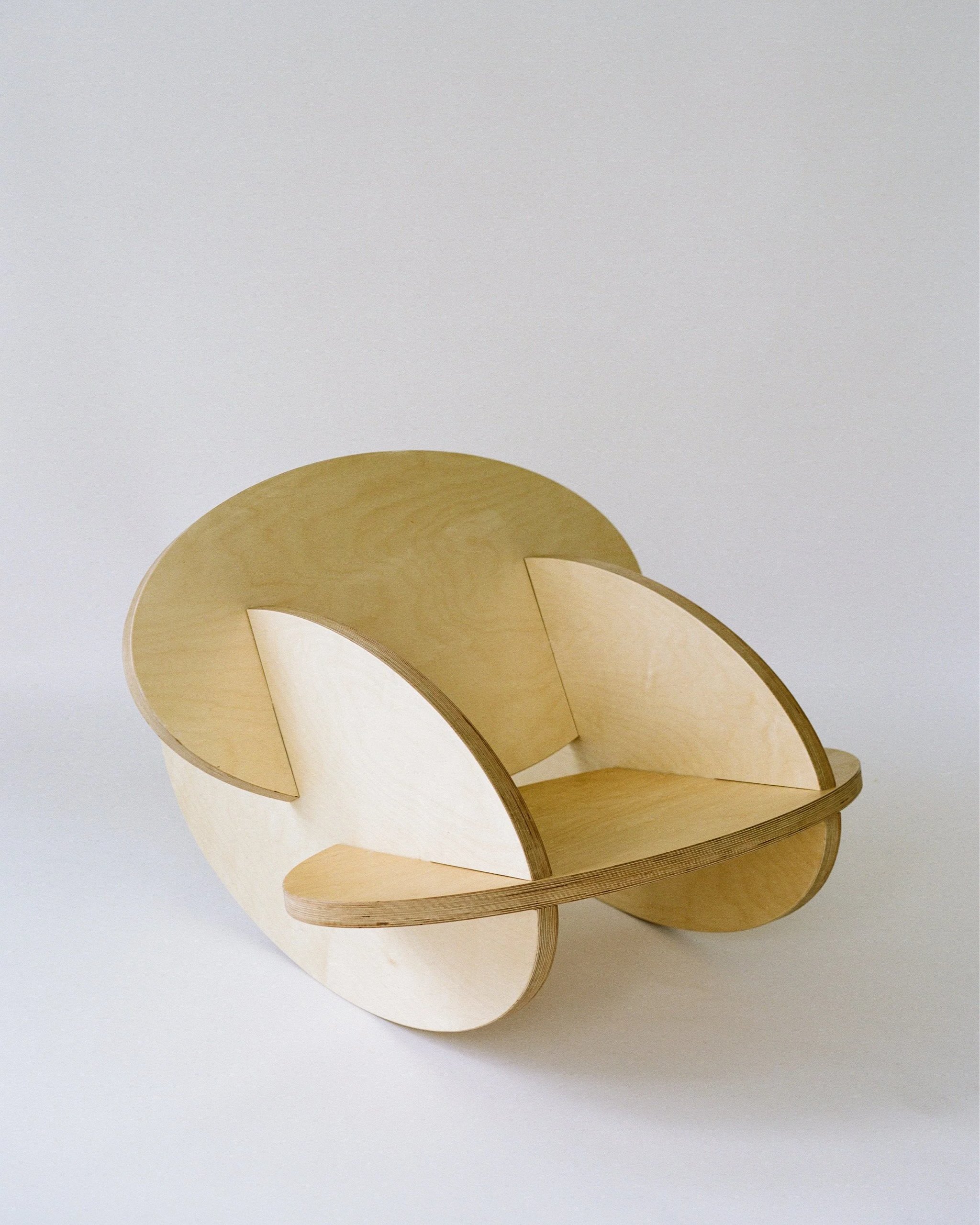 Oval Rocker is comprised of 4 identically shaped oval components at 1.5” thickness with varying slots to form a rocking chair when assembled.