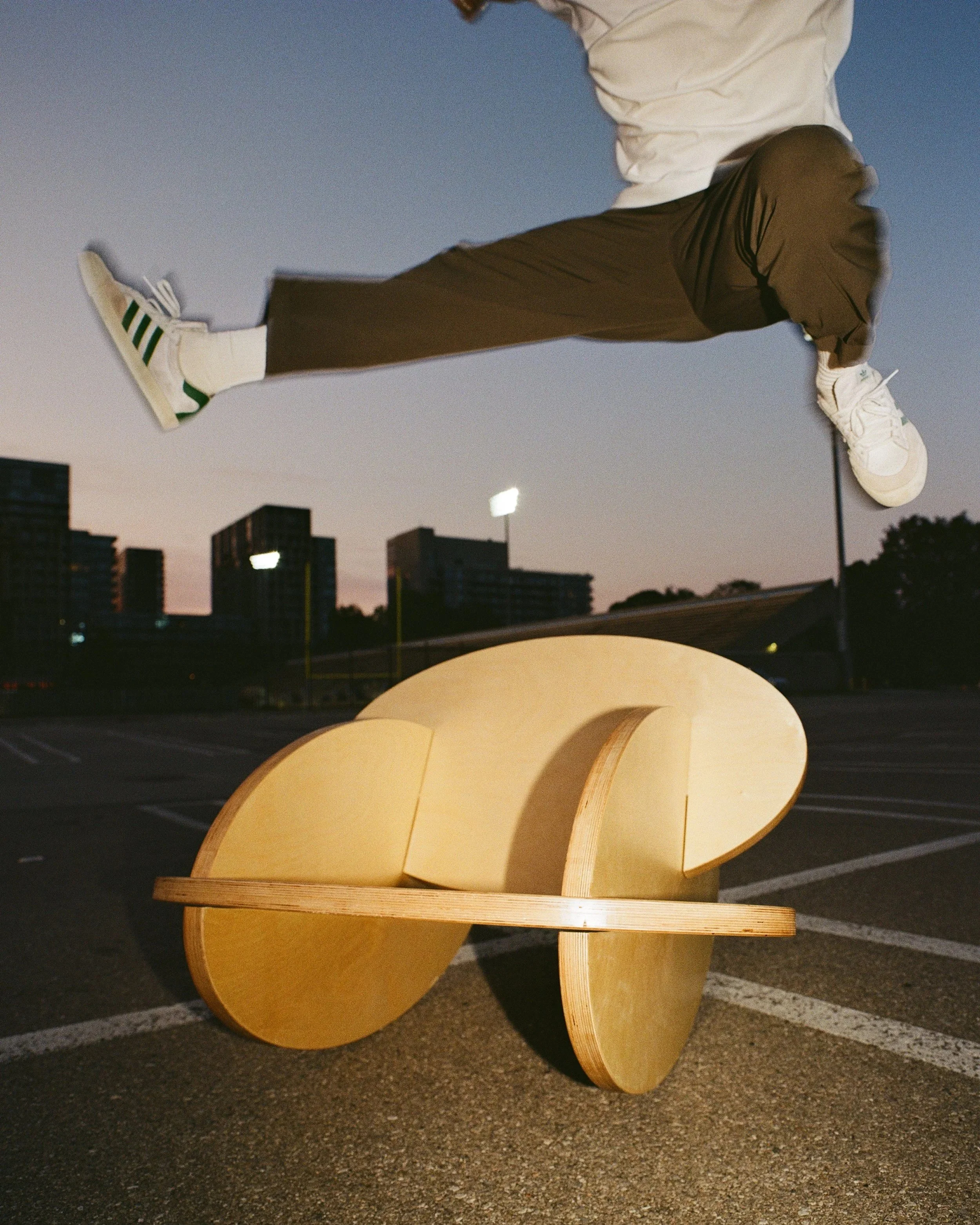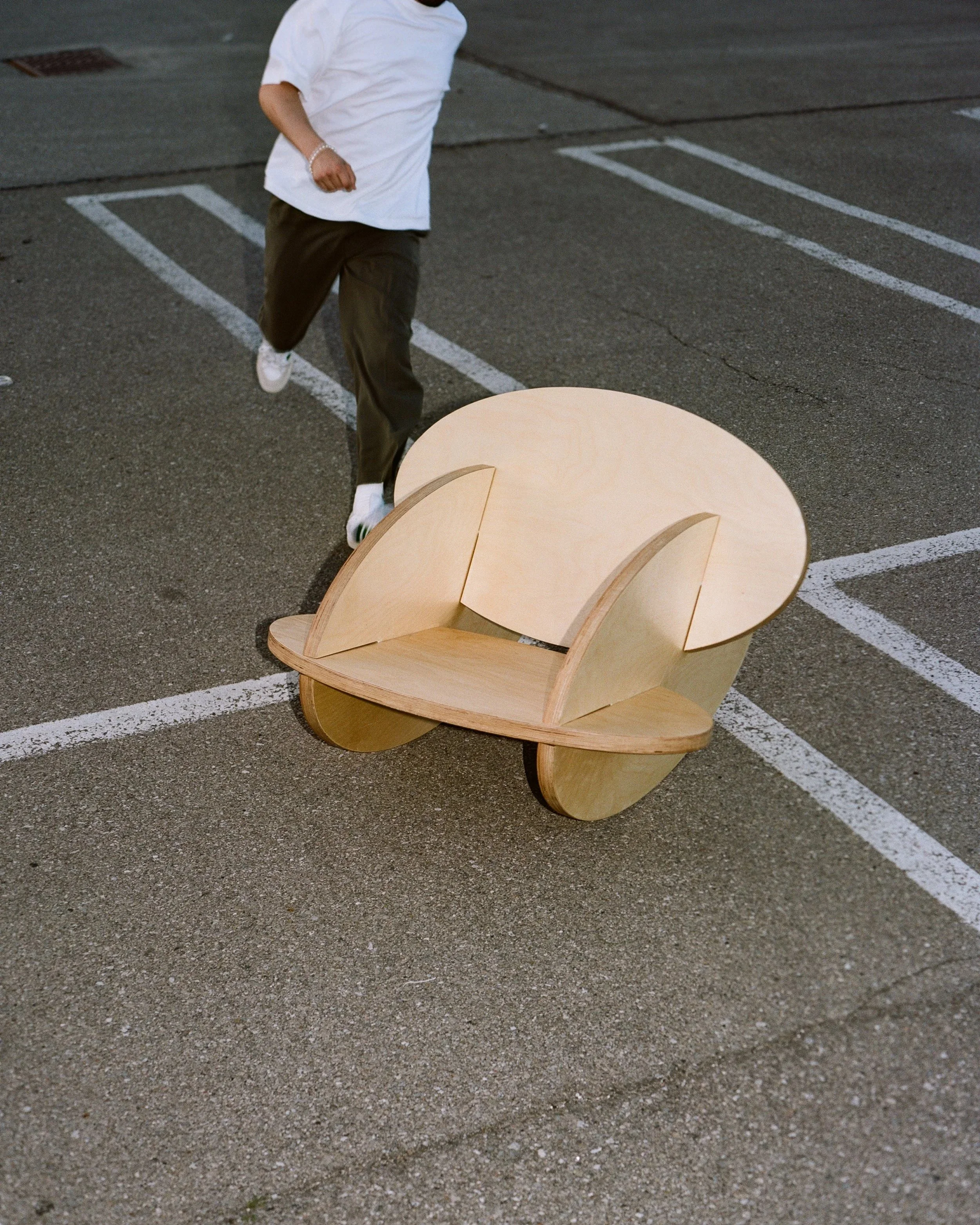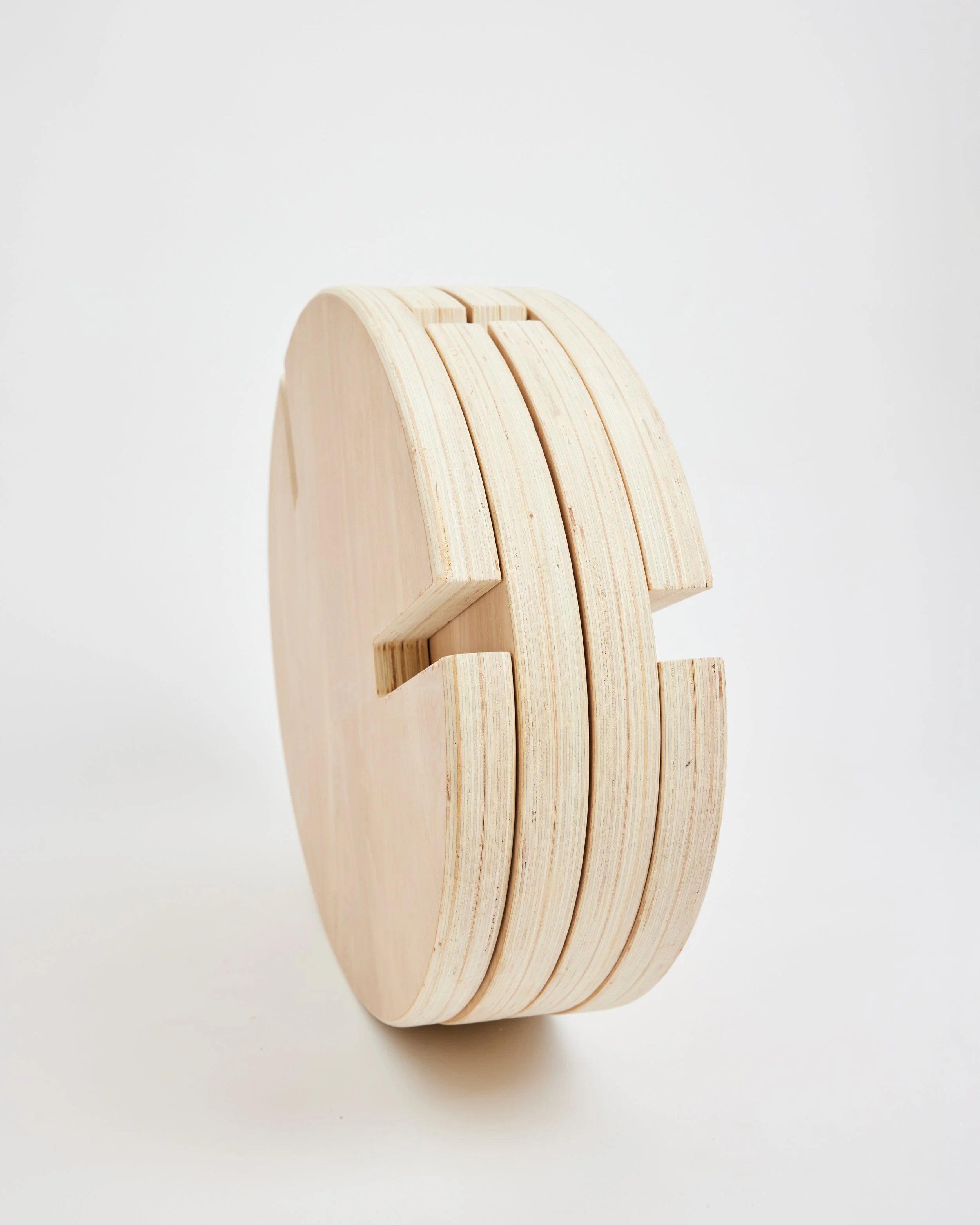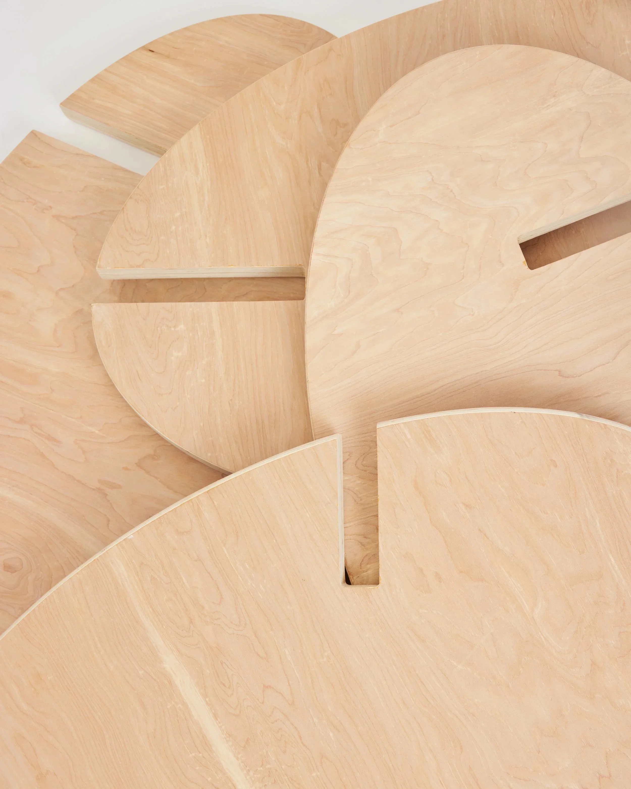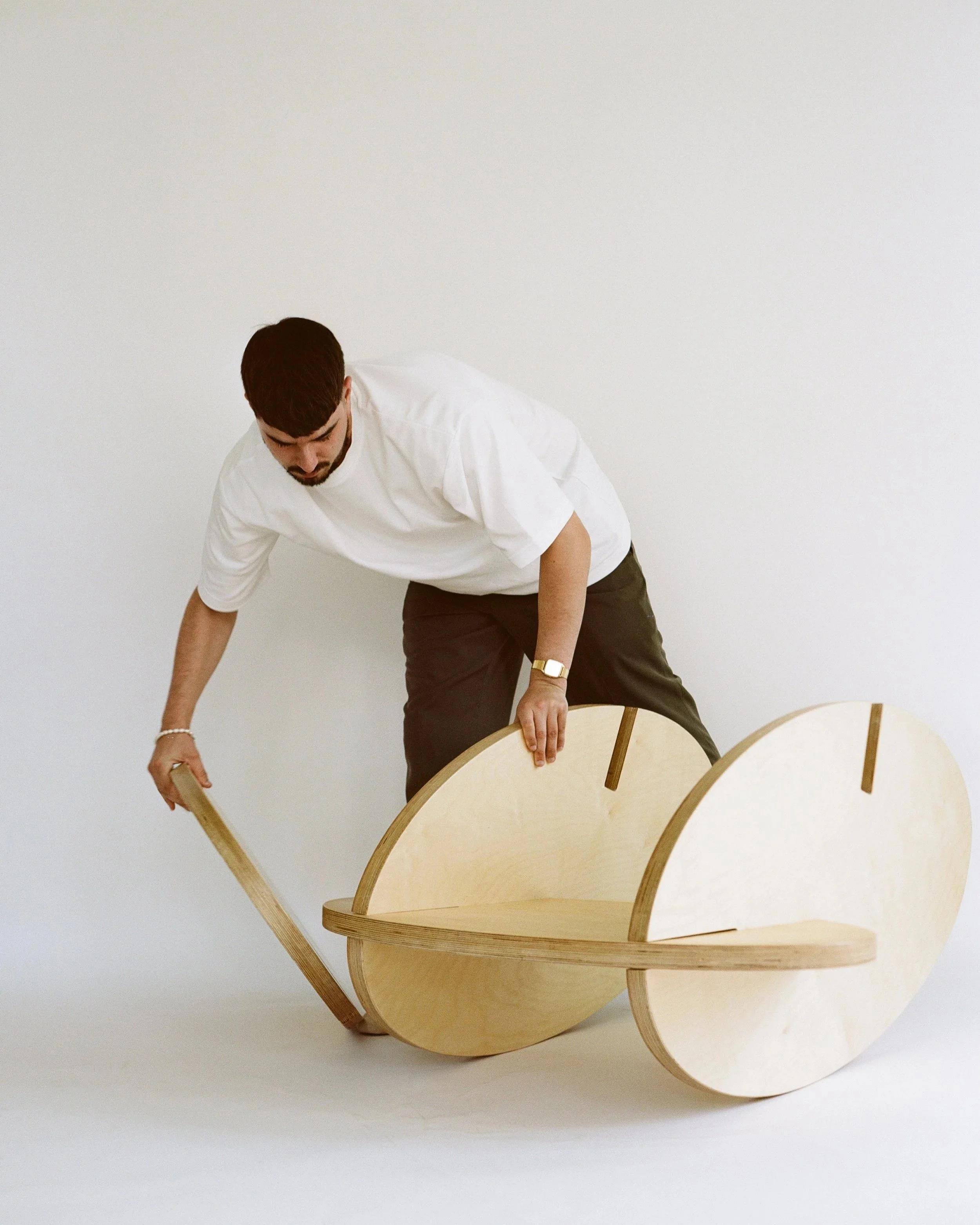 Oval Rocker is comprised of 4 identically shaped oval components at 1.5” thickness with varying slots to form a rocking chair when assembled.